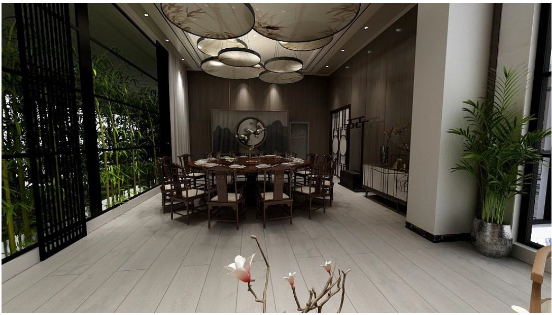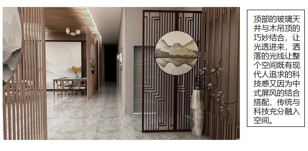 首先研究传统中式的风格,提取元素,其次研究现代风格,寻找新型材料,将其结合到一起,达到一个平衡点,项目设立 8 个包房, 12 个散台。搭建了室内景观,让客户更亲近自然。项目吊顶除了框架和木质吊顶,其余都是玻璃天井,项目位于大厦顶楼,透过玻璃可折射自然光线,而木质的吊顶和圆扇又可阻挡一部分光线。讲究一个“天时”。