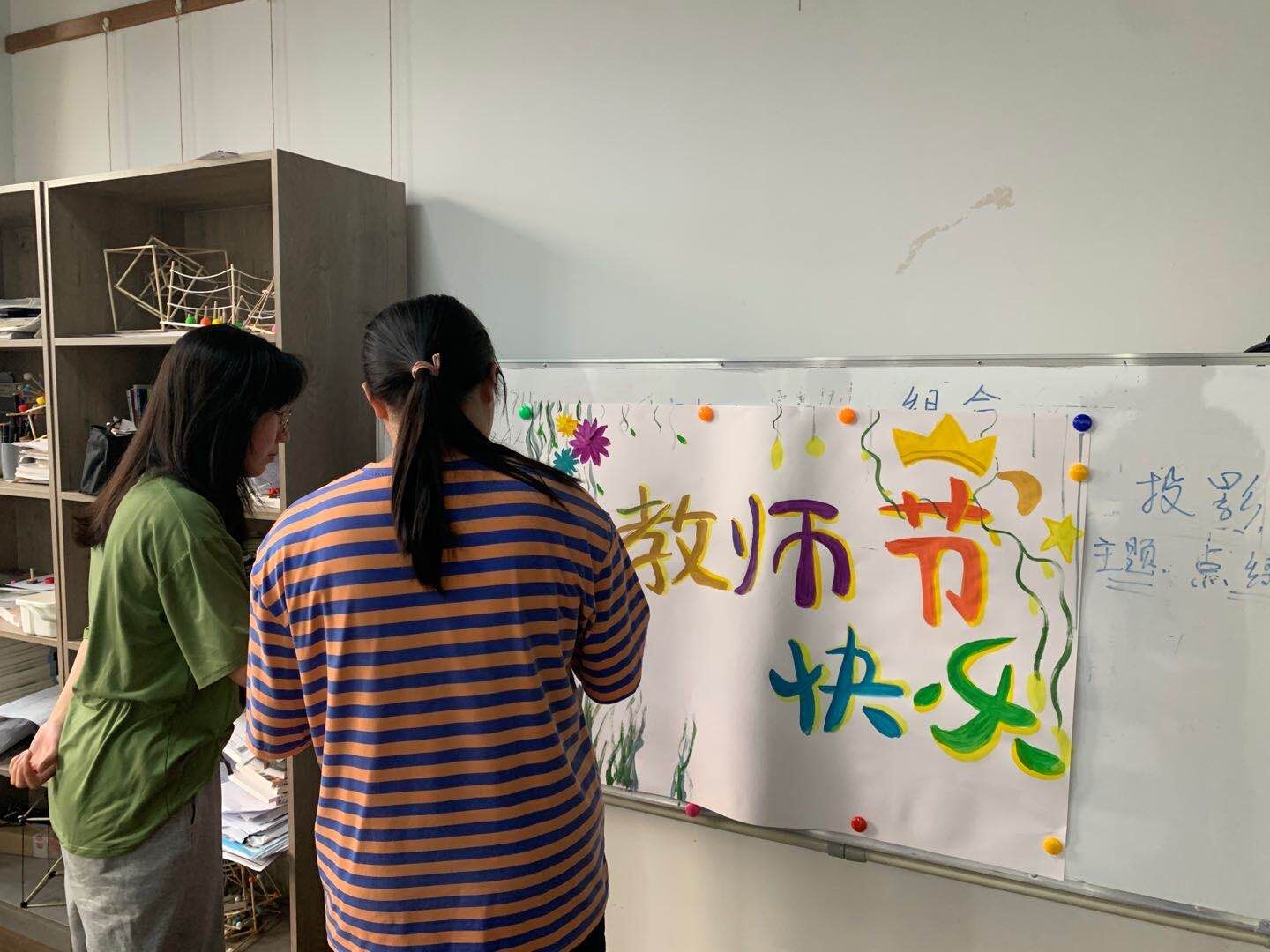 同学们发挥特长,在教室里制作精美的海报,一边绘制,一边还在讨论要给老师们什么样的惊喜,同学们将从老师那里学来的技能,回赠给老师们,这是最好的祝福。