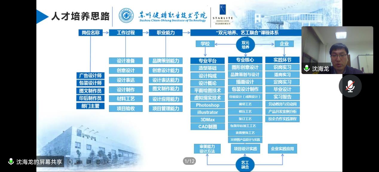 艺术设计学院于10月15日晚,在腾讯会议举办广告艺术设计专业2022级健雄-星光双元班开班仪式。党总支书记陈邦琼,筹建组副组长李鹏,广告艺术设计专业负责人沈海龙与广告专任老师及全体21、22级专业学生参加了会议。会议邀请了星光印刷(苏州)有限公司人事部蔡超经理莅临讲述企业情况。