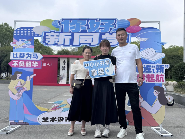 紧接着,志愿者们引导新生来到一旁的“心连‘新’,梦启航”主题墙前打卡。新生们在此留下了与健雄的第一张合影,其中也有父母亲人参与进来,共同纪念与健雄的初遇。