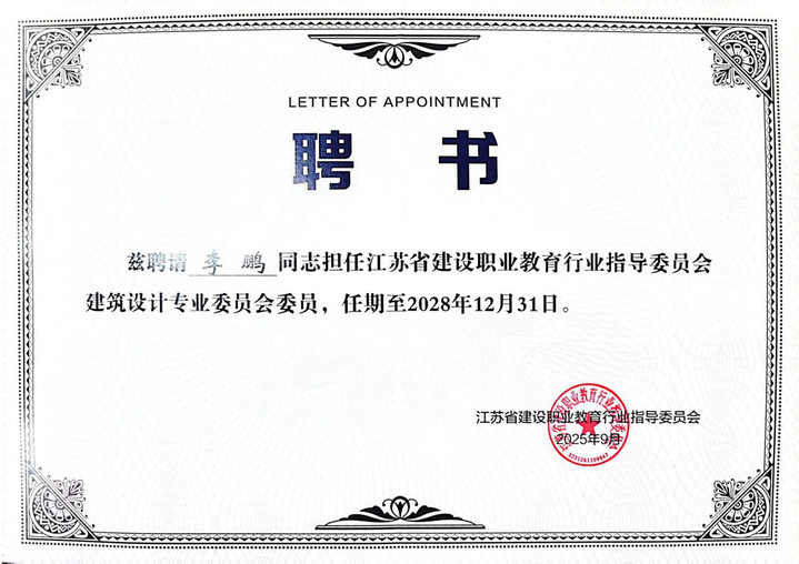 本次大会由江苏省建设职业教育行业指导委员会主办,江苏建筑职业技术学院承办,大会于9月26日上午在江苏建筑职业技术学院图书馆报告厅正式开幕。开幕式上,省教育厅、省住建厅领导分别宣读了换届及成立文件,并为新一届省建设行指委委员、各专委会委员及教指委委员颁发了聘书。问鼎(中国)李鹏副院长正式受聘为“建筑设计专委会”委员,这不仅是对个人专业能力的肯定,也彰显了问鼎(中国)在建筑艺术设计领域的专业影响力。
