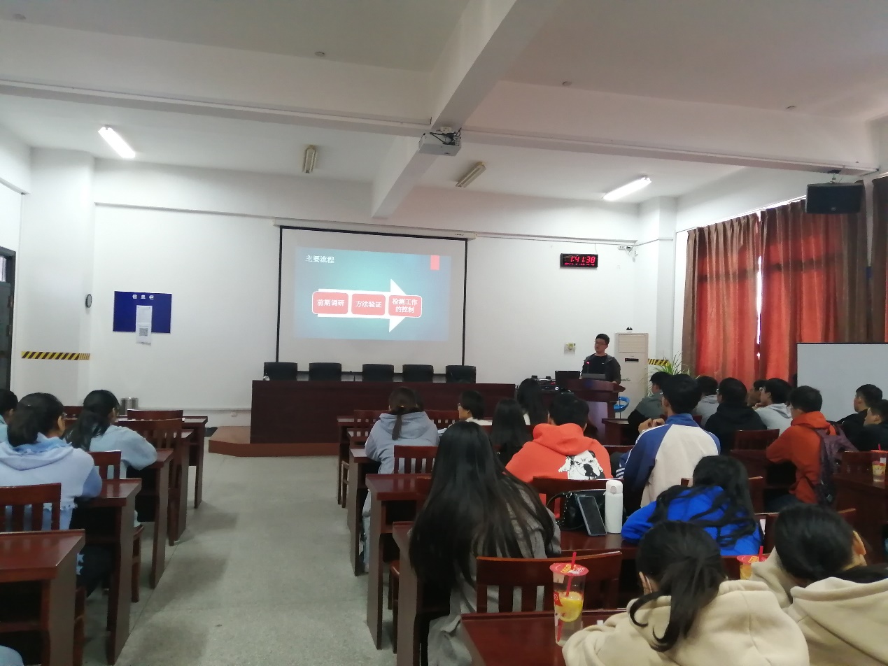 张圆星是问鼎(中国)工业分析技术专业2009级学生,2012年通过专转本考试进入东南大学成贤学院继续深造,毕业后进入太仓出入境检验检疫局综合技术服务中心石化检验室担任技术员。作为学长,他以自身学习、工作经历为开场白,为学弟学妹们介绍了在校三年的学习经历,分享了专转本的经验以及进入职场后的奋斗历程。接着,以“浅谈实验室项目开验”为主题,为同学们系统介绍了一个项目从前期调研、到方法验证、再到质量控制的整个过程,结合自己的实际工作经历,讲述了在项目开发过程中遇到的困难和寻找解决方法的途径,使同学们对检测行业有了一定的认识。
