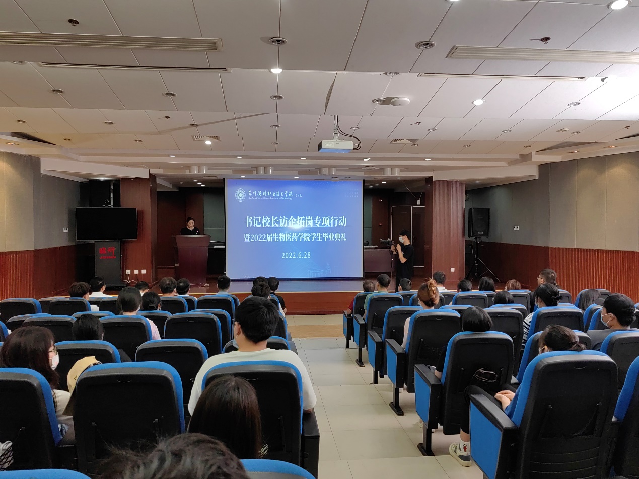 6月28日下午,生物医药学院在昭衍(苏州)新药研究中心有限公司报告厅举行2022届学生毕业典礼,太仓沙溪镇党委副书记、镇长王永伟、太仓沙溪镇党委委员、生物医药产业园管委会副主任王建宏、学院党委委员、副校长周晓刚、校合作教育处副处长王学戏、以及来自昭衍新药、信立泰药业、百因诺生物、拓维生物、赛业生物五家企业的领导、生物医药学院筹建组全体成员及辅导员、班主任代表共60余人出席活动。毕业典礼由生物医药学院院长顾准教授主持。