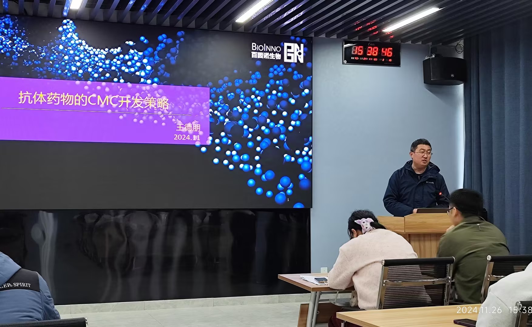王总以通俗易懂的语言,解释了生物药物特别是抗体类药物生产中的CMC(化学成分、制造和控制)概念,分析了药物生产CMC开发全流程以及相关的质量研究和工业验证。对于大家感兴趣的CMC开发中的步骤、参数、目标,王总都进行了详细的理论讲解,同时还将企业实际生产案例穿插其中,让听众收益匪浅。集中讲座结束后,王总和博士教师进行了交流互动,回答了大家的学术问题。王总还邀请师生到百因诺参观,体验真实的企业生产环境,把课本上学到的知识和实际生产结合起来。