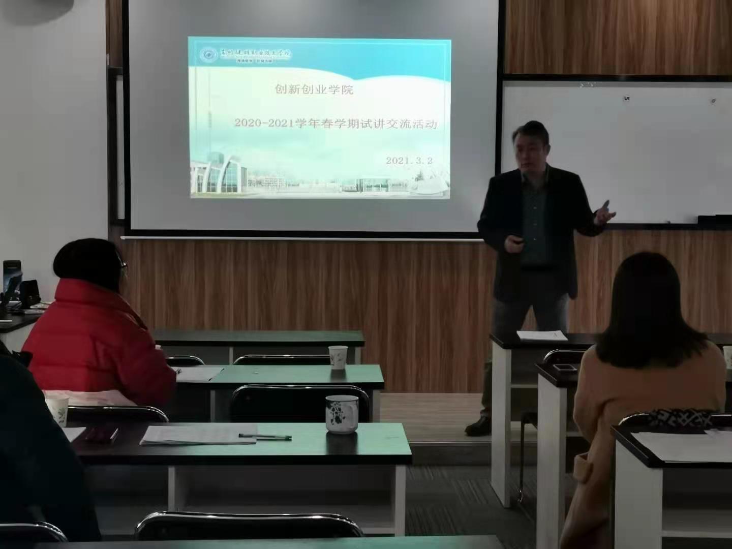 3月2日下午,创新创业学院(筹)在二期105举办新开课试讲和外聘教师试讲活动。本次试讲针对本学期新开课程以及外聘老师新上课,由学院霍彧院长、朱慧副院长、何茂昌副院长和英语数学团队主任及课程组老师担任评委。