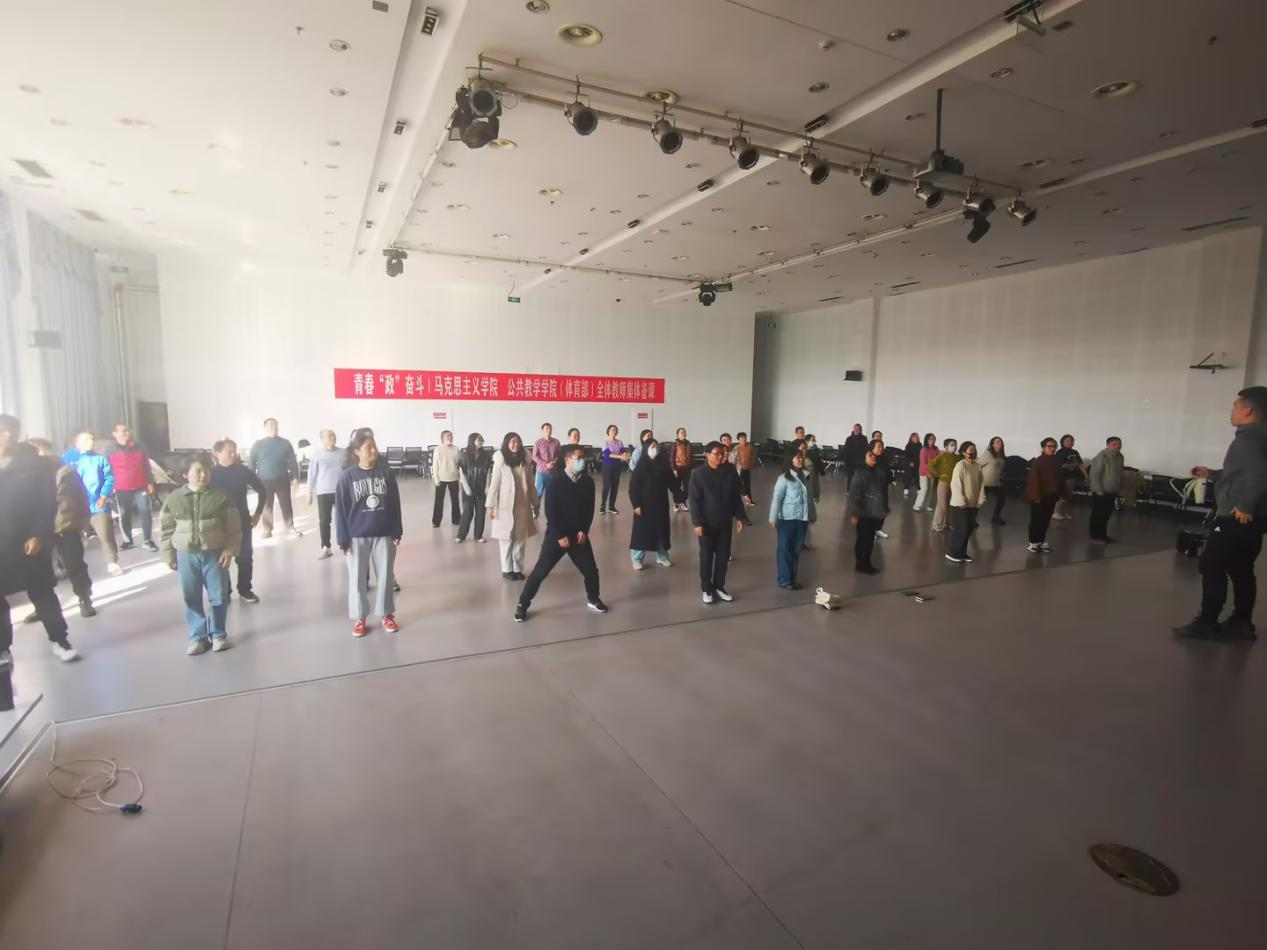 本次活动由体育部主导,刘广老师担任主讲,并邀请教务处韩学芹处长前来指导。周惠英、刘慧担任课程评价教师,刘金担任体育委员,此外,鲜光耀、刘金、方皓、陈乐乐担任各小组组长。课程由课前、课中、课后三个环节组成,每个环节都渗透了严格的教学要求:通过课前体育委员的集合整队以及教师的任务布置,从准备活动到课堂教学、分组练习、队形创编、小组展示、评价小结,最后再到课后总结,每个环节都如火如荼的进行,每位老师也都认真学习,冰冷的多功能厅也因为大家的汗水及热情变得温暖及欢快。