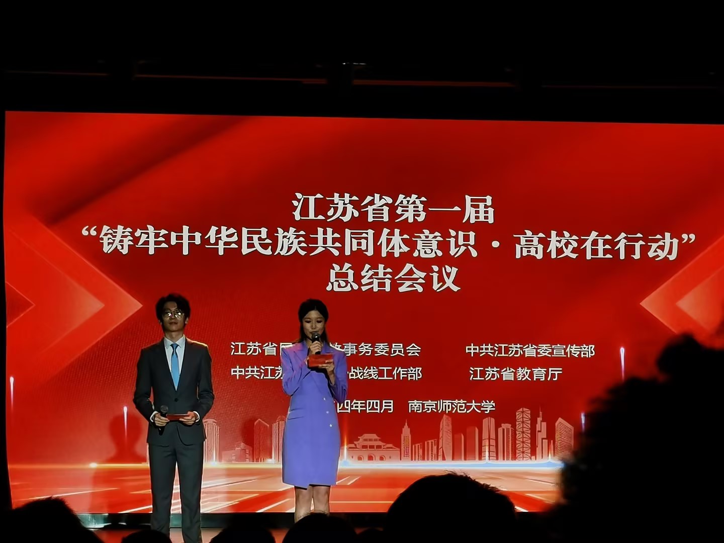 4月12日,江苏省民族宗教事务委员会、中共江苏省委宣传部、中共江苏省委统一战线工作部、江苏省教育厅共同主办的江苏省第一届“铸牢中华民族共同体意识·高校在行动”系列活动总结会在南京师范大学召开,我校党委委员丁锴、马克思主义学院教师吴洁出席本次会议。