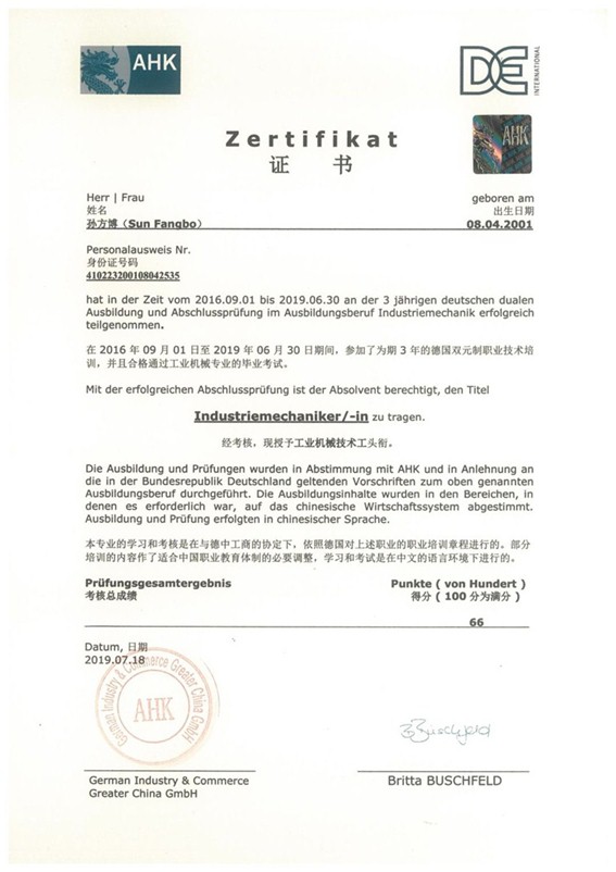 能力鉴定:双元制职业教育协会颁发《生产设备技术员》证书;德国工商会颁发《工业机械工》职业资格证书。